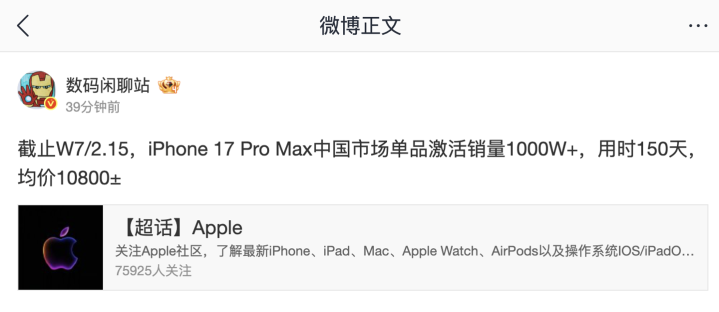 IT之家2月24日消息,博主@数码闲聊站今天在微博透露,截至2026年第七周/2月15日,苹果iPhone17ProMax手机中国市场单品激活销量突破1000万台,用时150天,均价10800±。